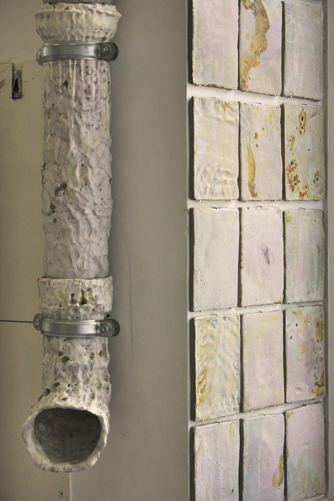Tuiles plates et verres dormants. Grès, émaux de cendres, 2023.